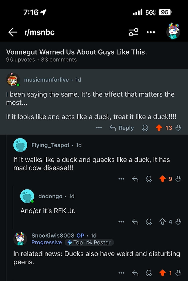 To be clear, I’m not outraged. I’m delighted. America has never known what to do with people who say things plainly. We jailed Eugene V. Debs for opposing a war, blacklisted the Dixie Chicks for opposing another one, and now, in this brave new world of digital decorum, we delete a comment for comparing a fascist’s (well-documented) weird dick to a duck’s. Obviously the line between “insightful political commentary” and “waterfowl obscenity” is one the mods enforce with puritanical consistency.